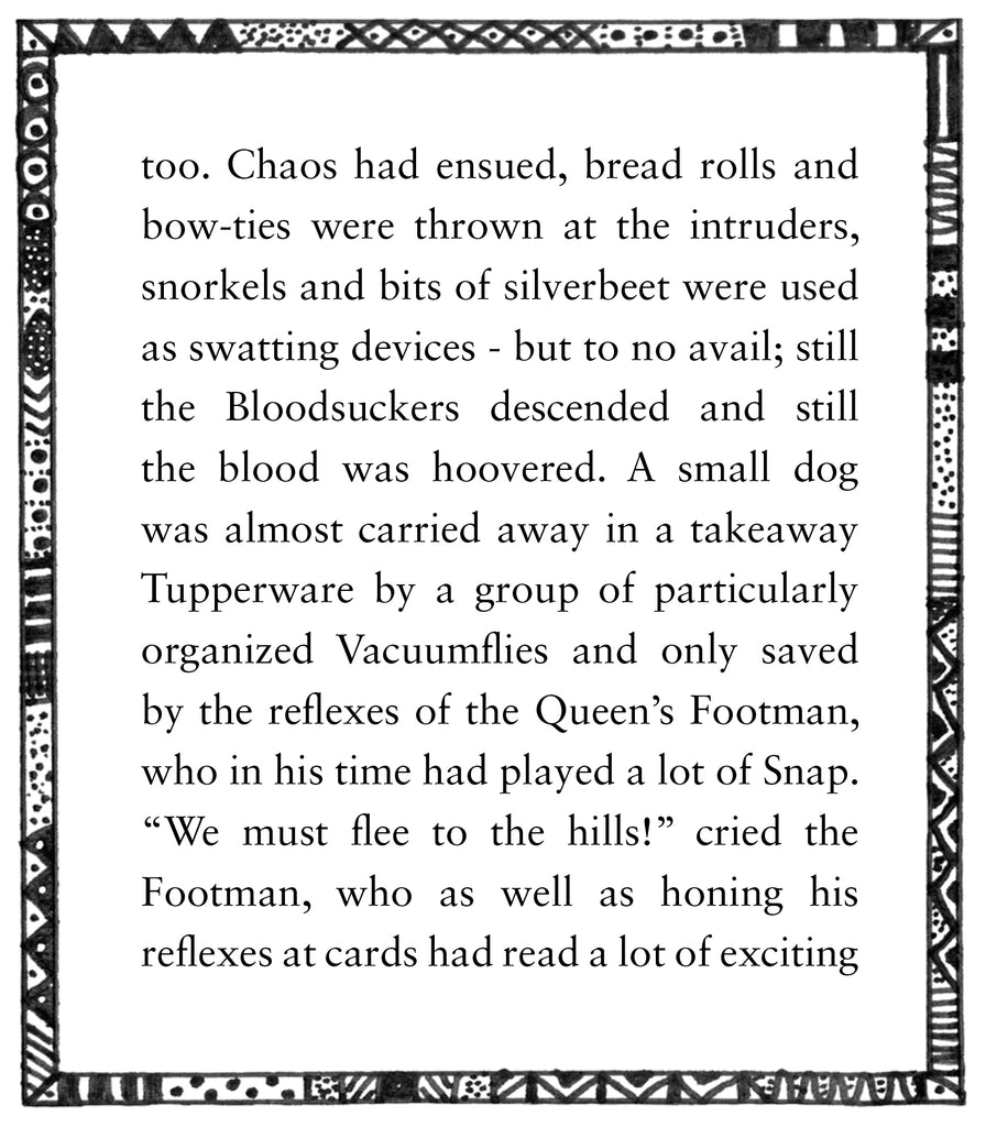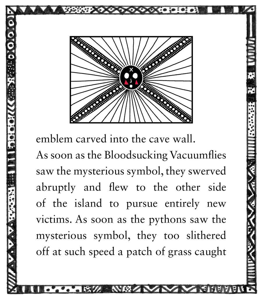As soon as the Bloodsucking Vacuumflies saw the mysterious symbol, they swerved abruptly and flew to the other side of the island to pursue entirely new victims. As soon as the pythons saw the mysterious symbol, they too slithered off at such speed a patch of grass caught fire. As soon as the fire caught sight of the mysterious symbol, it threw itself into a nearby stream and extinguished itself. The Royal Party cheered, had a shot of jam and toasted their new talisman.