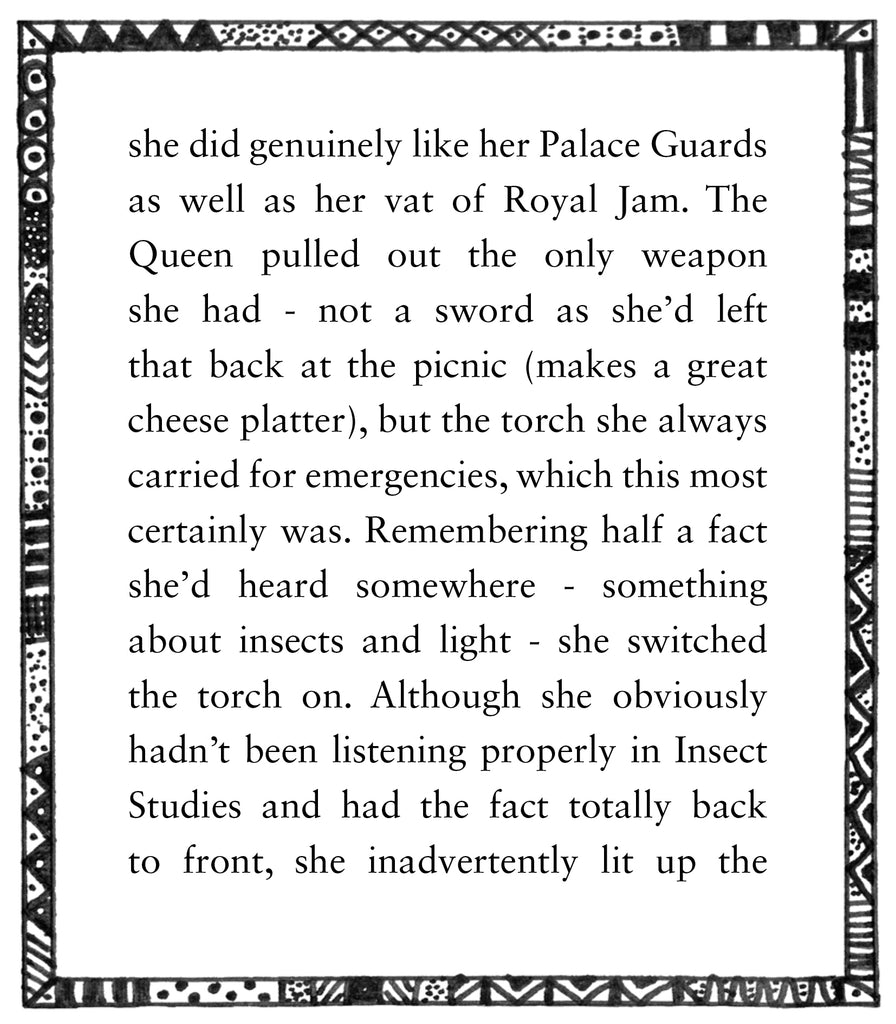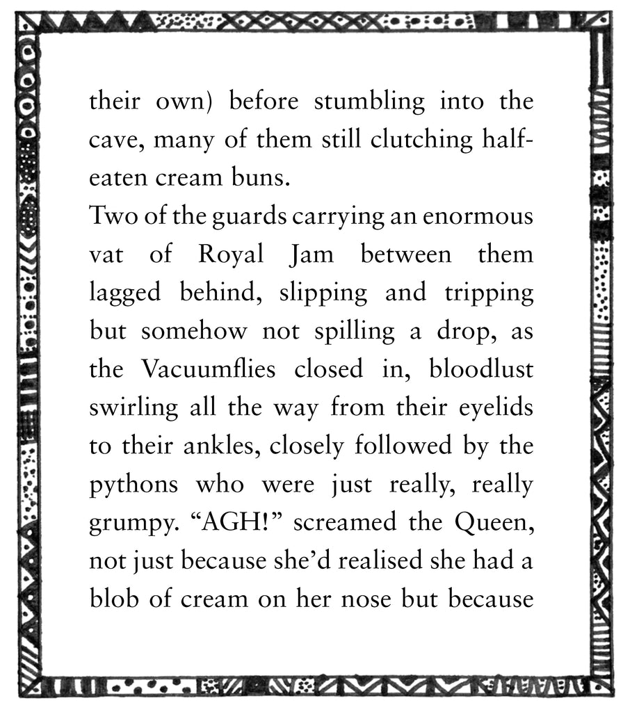 Two of the guards carrying an enormous vat of Royal Jam between them lagged behind, slipping and tripping but somehow not spilling a drop, as the Vacuumflies closed in, bloodlust swirling all the way from their eyelids to their ankles, closely followed by the pythons who were just really, really grumpy. “AGH!” screamed the Queen, not just because she’d realised she had a blob of cream on her nose but because she did genuinely like her Palace Guards as well as her vat of Royal Jam. The Queen pulled out the only weapon she had - not a sword as she’d left that back at the picnic (makes a great cheese platter), but the torch she always carried for emergencies, which this most certainly was. Remembering half a fact she’d heard somewhere - something about insects and light - she switched the torch on. Although she obviously hadn’t been listening properly in Insect Studies and had the fact totally back to front, she inadvertently lit up the emblem carved into the cave wall.